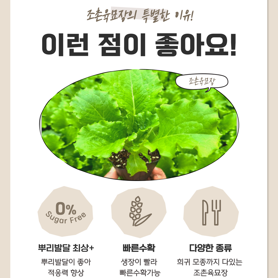컵모종 형태로 생산하여 1구씩 키워 크기가 크고 뿌리발달이 좋아 환경 적응력이 좋은 모종입니다