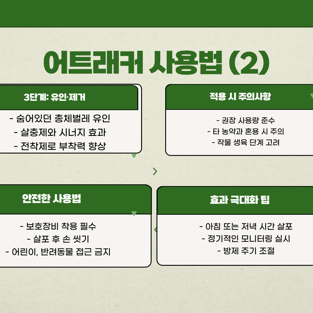 어트래커의 유인 메커니즘과 살충제 시너지 효과, 전착제·미량요소의 역할을 아래 이미지로 자세히 확인해 보세요.